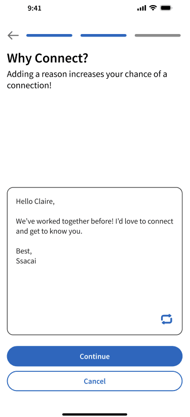 A UX concept redesign that encourages more thoughtful networking by introducing a required message step with optional AI support when sending connection requests.