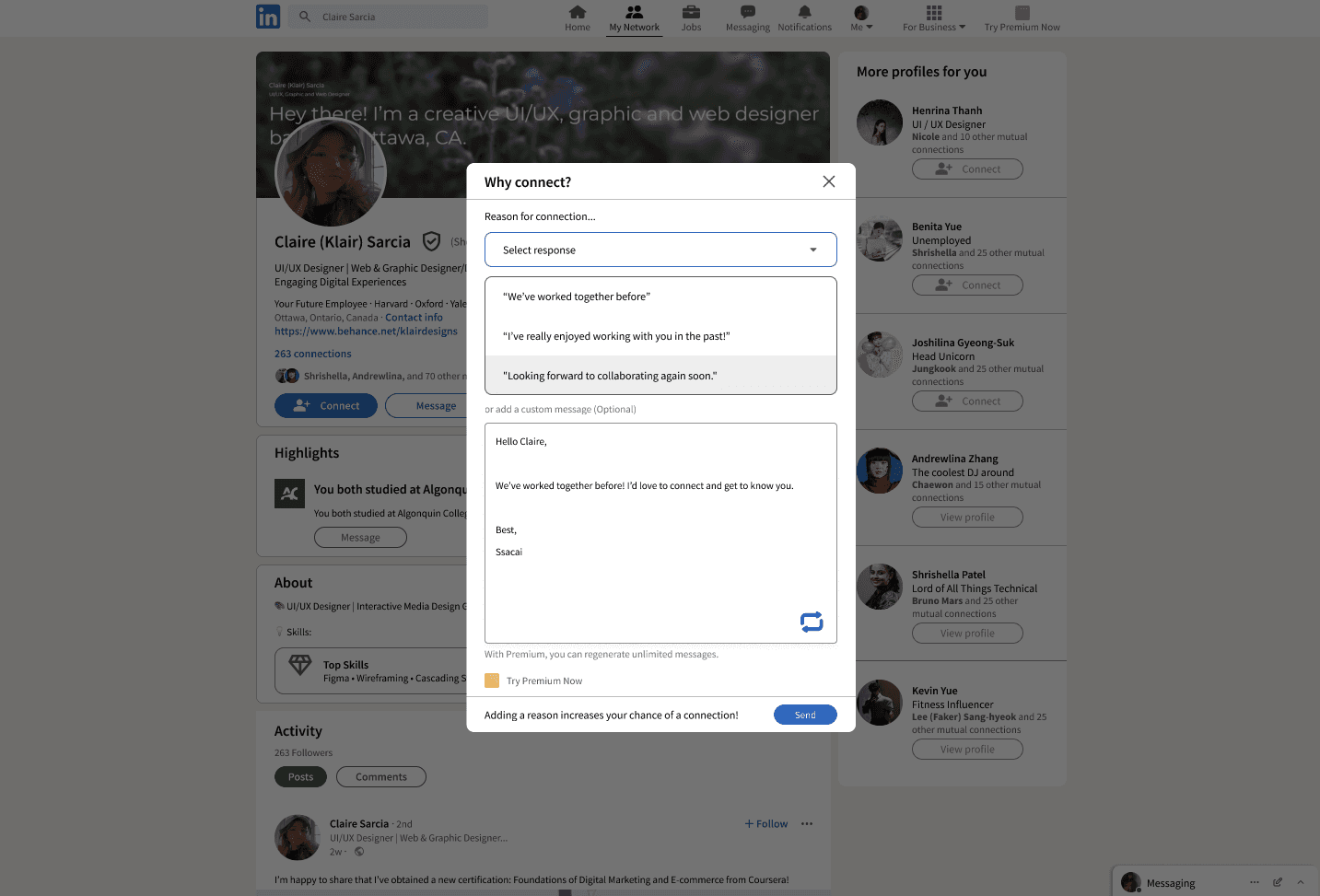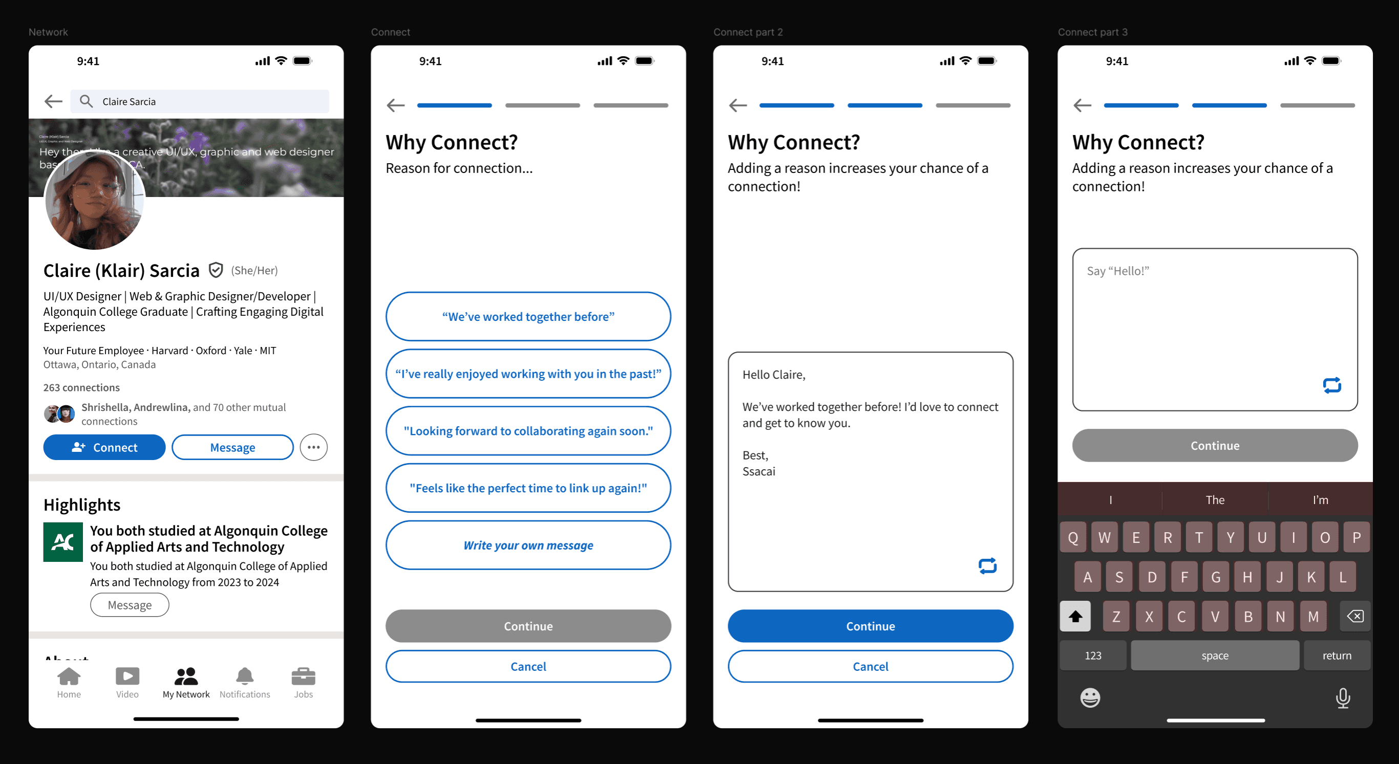This concept redesign demonstrates how small UX interventions can meaningfully shift user behavior at scale. By reframing connection requests as moments of intention—not just clicks—the experience encourages more genuine professional interactions.